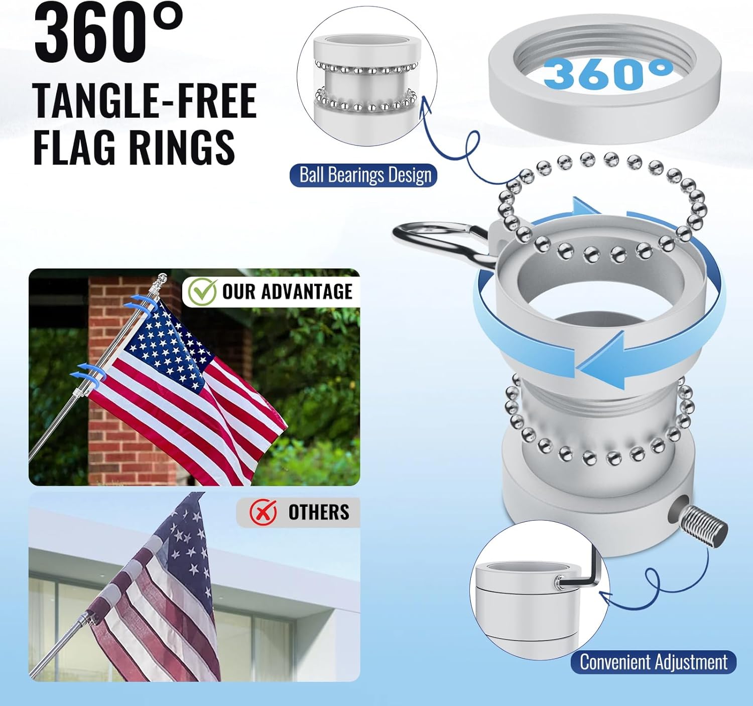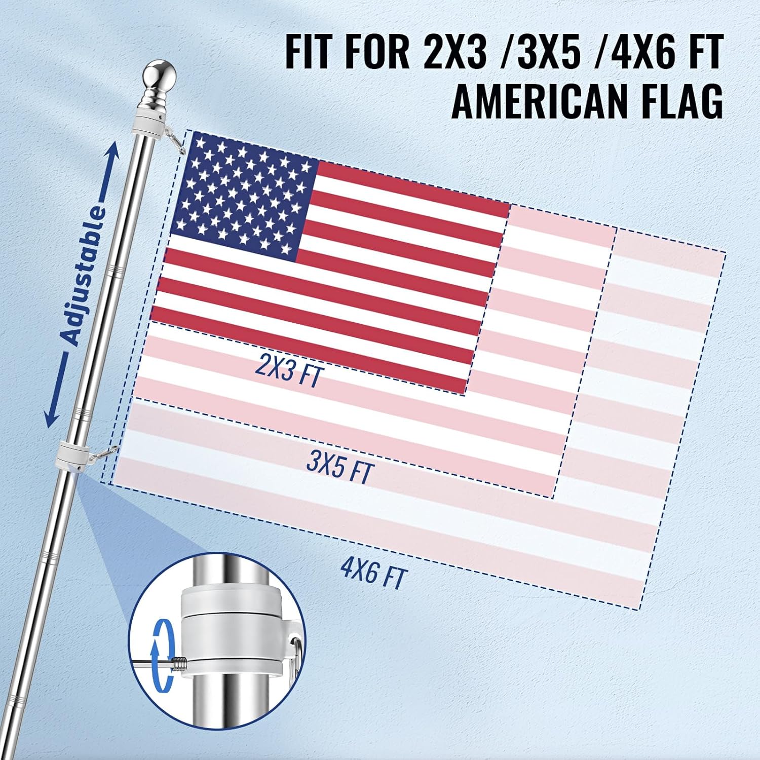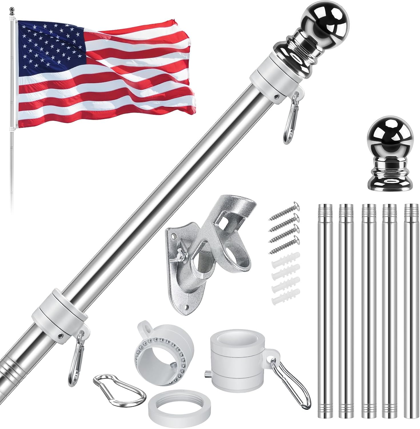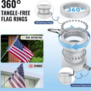 American Flag Pole Kit, Including 100% Polyester 3×5 ft US Flag, 5 Ft Aluminum White No Tangle Spinning Pole and Multi-Position Flag Pole Bracket